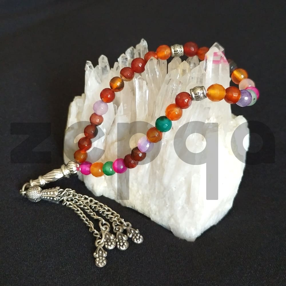 Metal Püsküllü Kesme Mix Akik Taş Tesbih 6mm